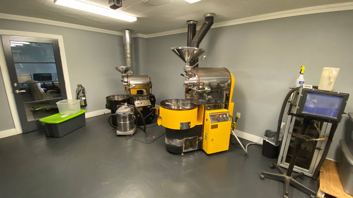 Roasting is serious business. Here's our Ambex Coffee Roaster machines, with the one on the right being a YM-15 model, which has a 33 lb batch capacity, with 4 motors and over 100,000 BTU's. It also weighs over 720 lbs!